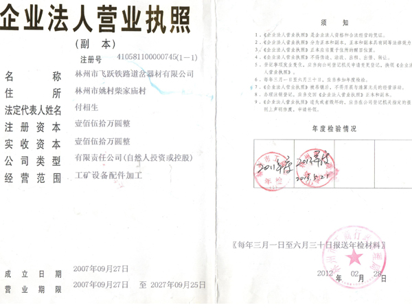 林州市飛躍鐵路道岔器材有限公司位于舉世聞名的世界八大奇跡之一“人工天河”紅旗渠畔,晉、冀、豫三省交界處,交通、通訊便捷。 公司擁有職工和管理人員120多人,高工5名,技術人員23人。擁有先進的鑄造機加工設備和完整的質量檢測體系,使我公司連續數年被評為“重合同守信用”和“重量管理”先進單位。公司生產的主要產品有:輕重軌道岔及各種工具。按種類區分有:單開道岔、對稱道岔、三開道岔、渡交組合道岔等。特殊要